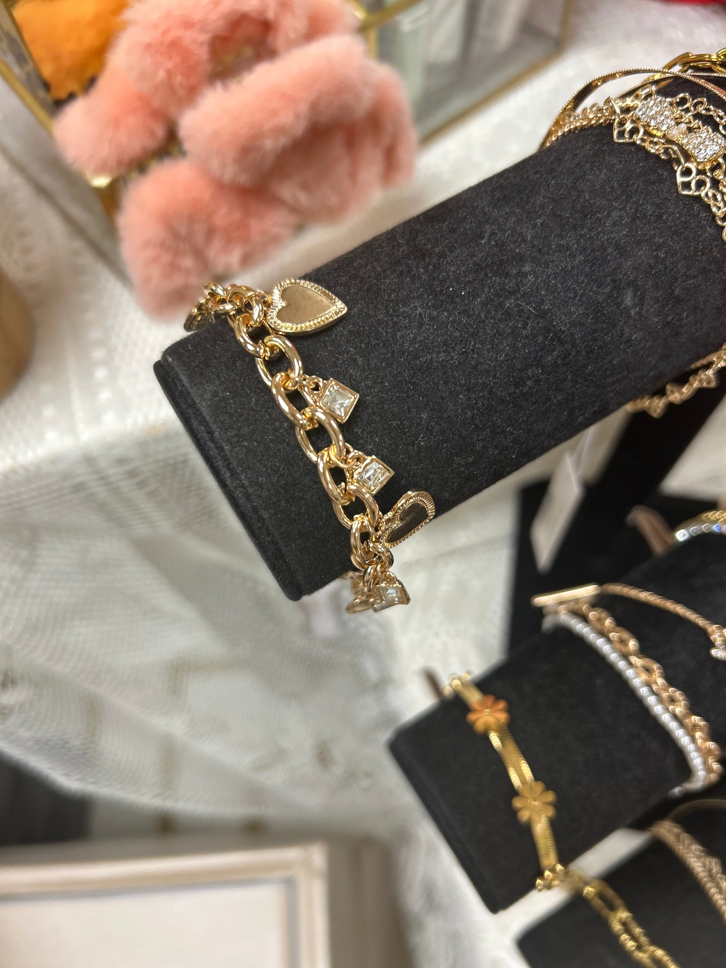 Spread the love with this dazzling gold heart charm bracelet! Featuring shimmering rhinestone-adorned hearts that catch the light with every gesture, this playful piece adds instant sparkle to your wrist. Perfect for stacking with your favorite bracelets or wearing solo as a statement accessory, it's the ultimate way to wear your heart on your sleeve—literally. Whether you're treating yourself or gifting it to someone special, this charming bracelet brings joy and glamour to any occasion.