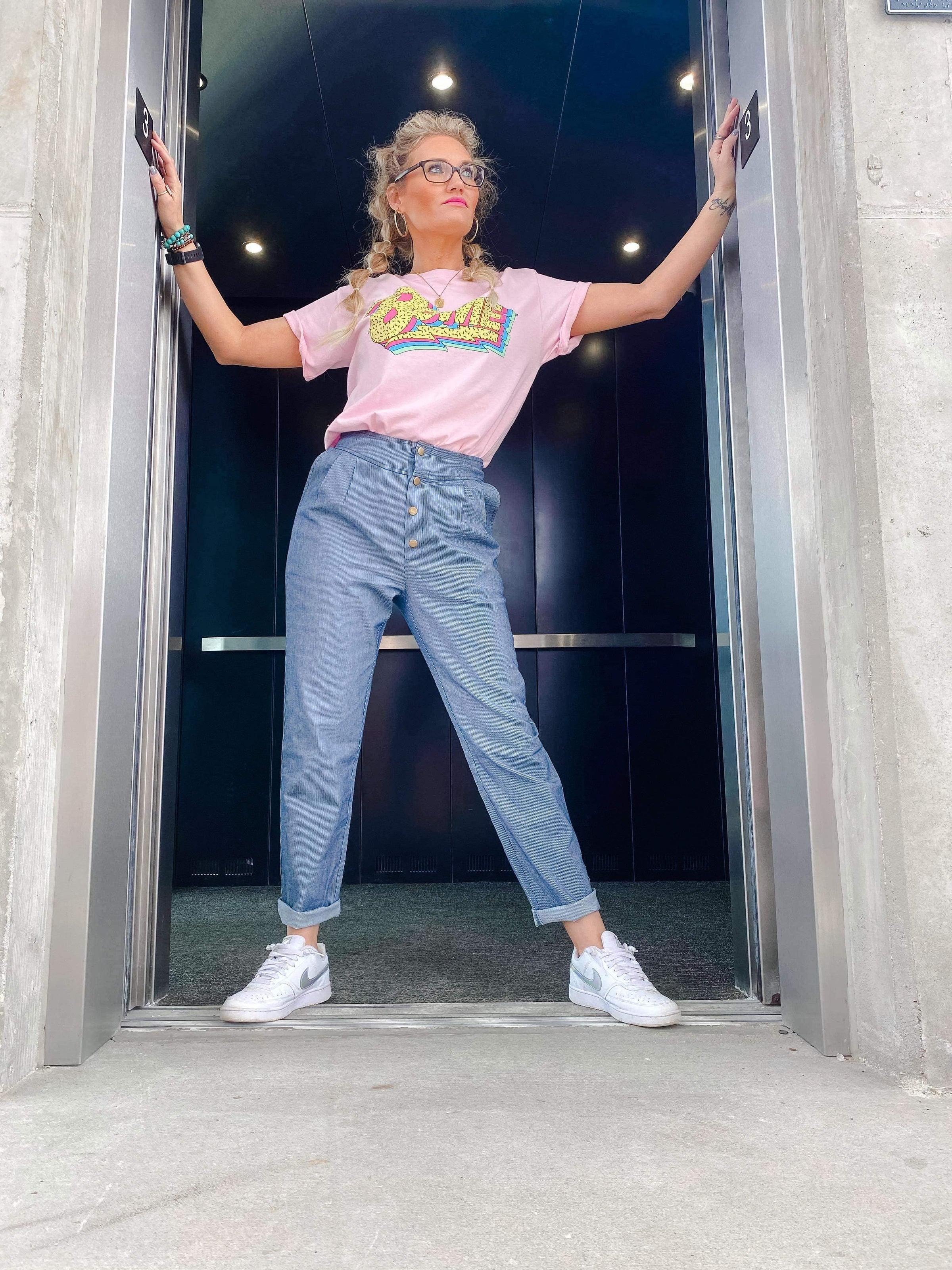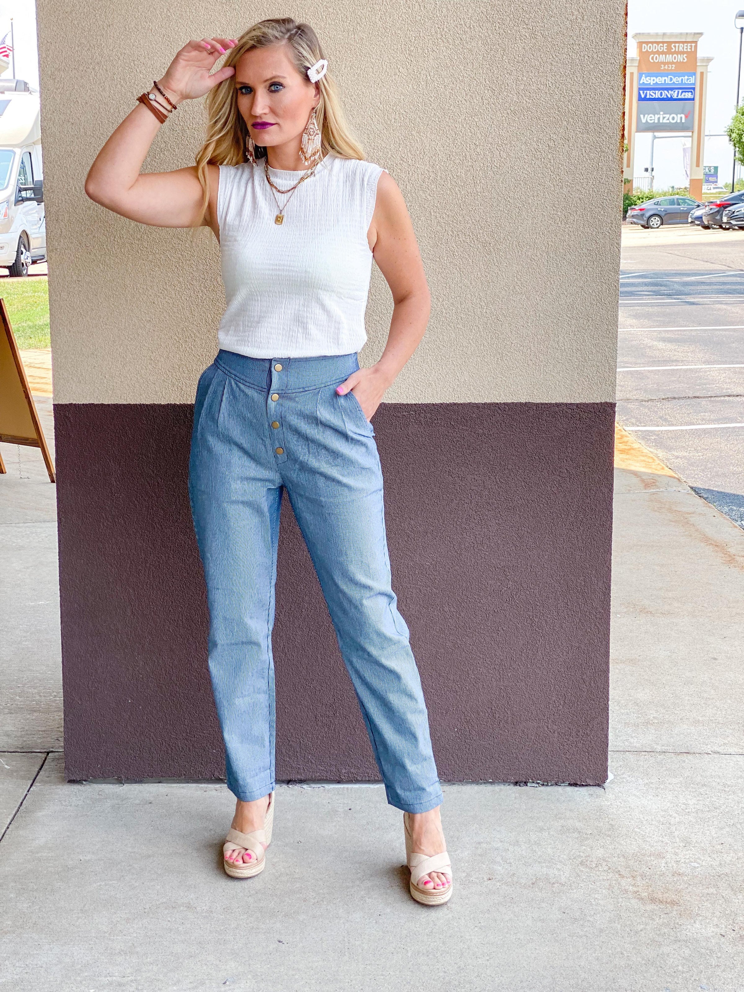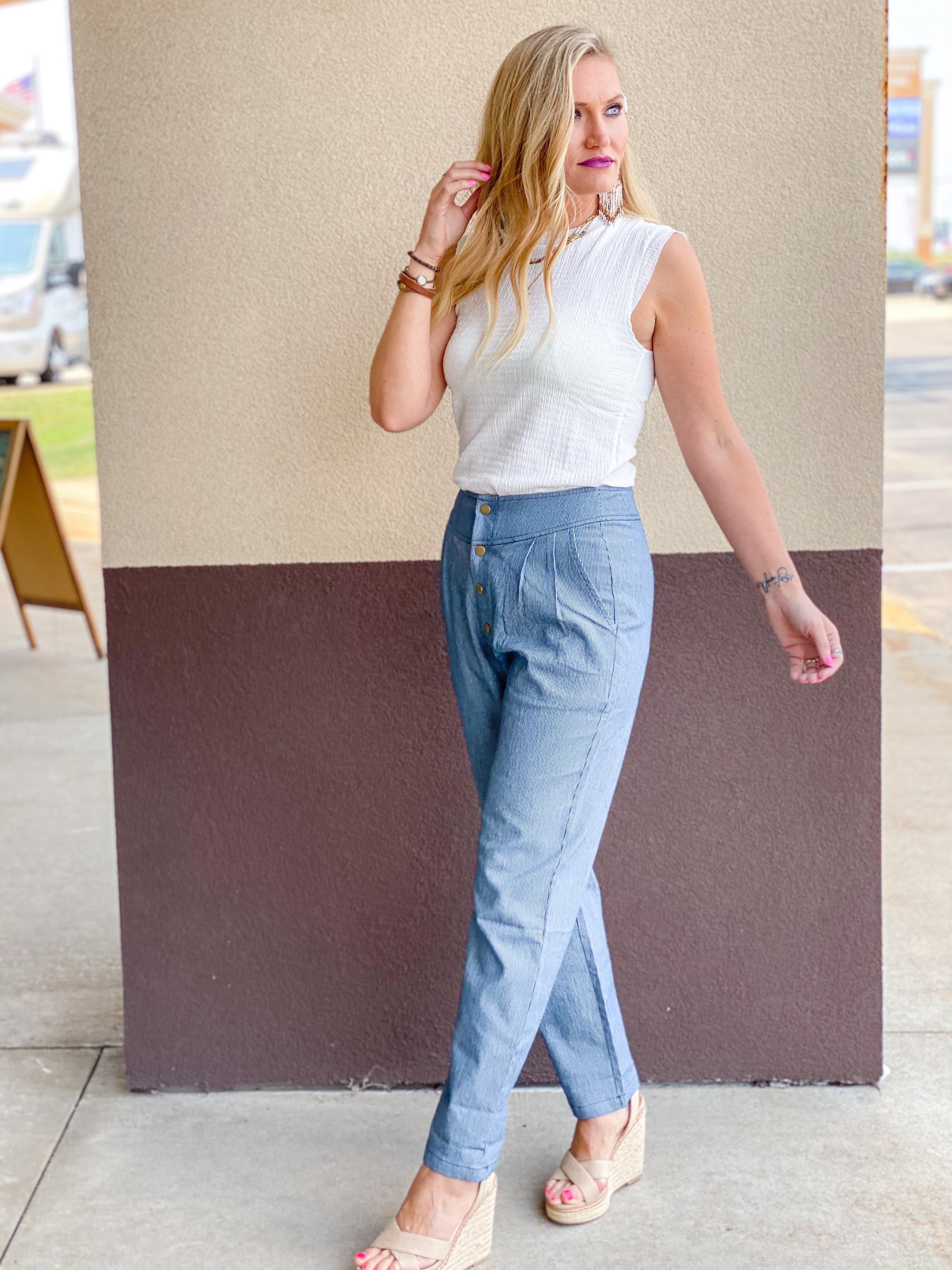 Looking for the perfect pants to wear both in and out of the office? You have found the perfect pair. These navy pants feature pinstripes throughout and a high waist with a button fly. They are sharp, flattering and fit the body to a T!