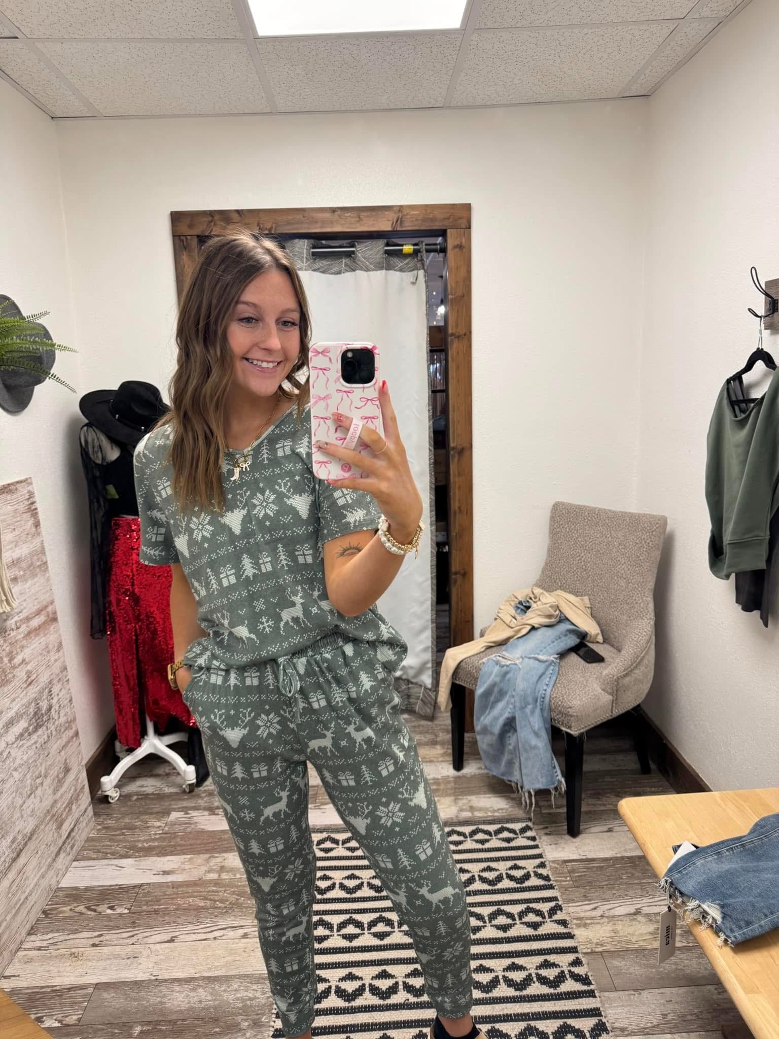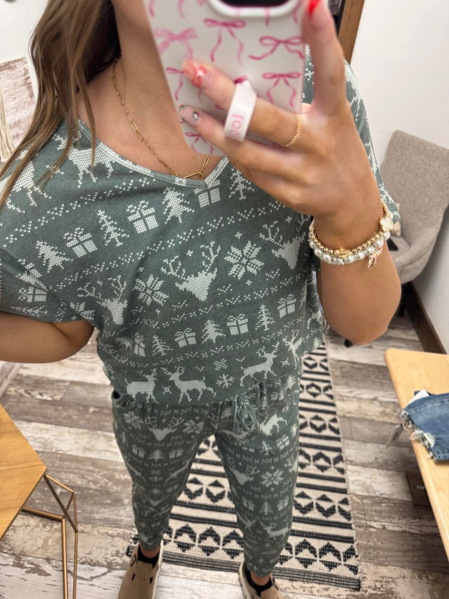 Stay cozy and stylish this holiday season with our Reindeer Jogger Christmas PJS! Made from super soft material, these sage green joggers feature a v-neck and a cute stitch pattern. Perfect for lounging or wearing all day long, these PJs will be your go-to choice for comfort and fashion.