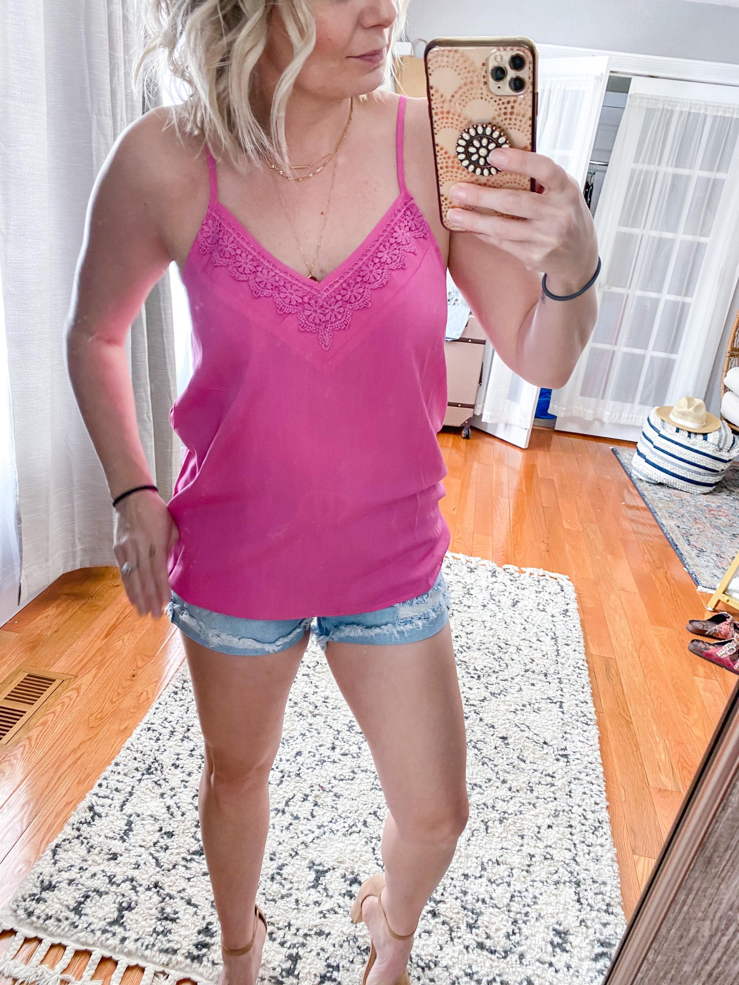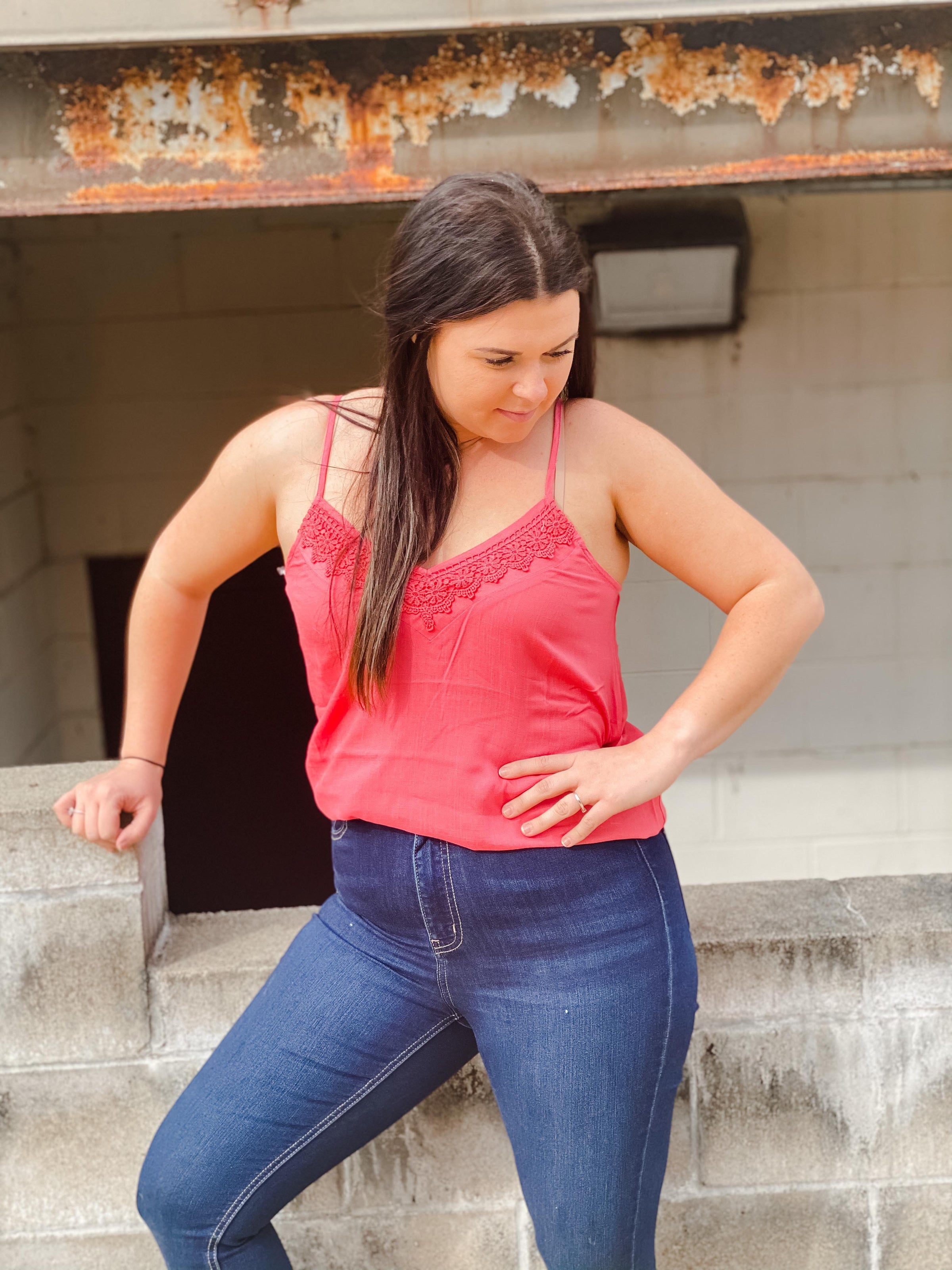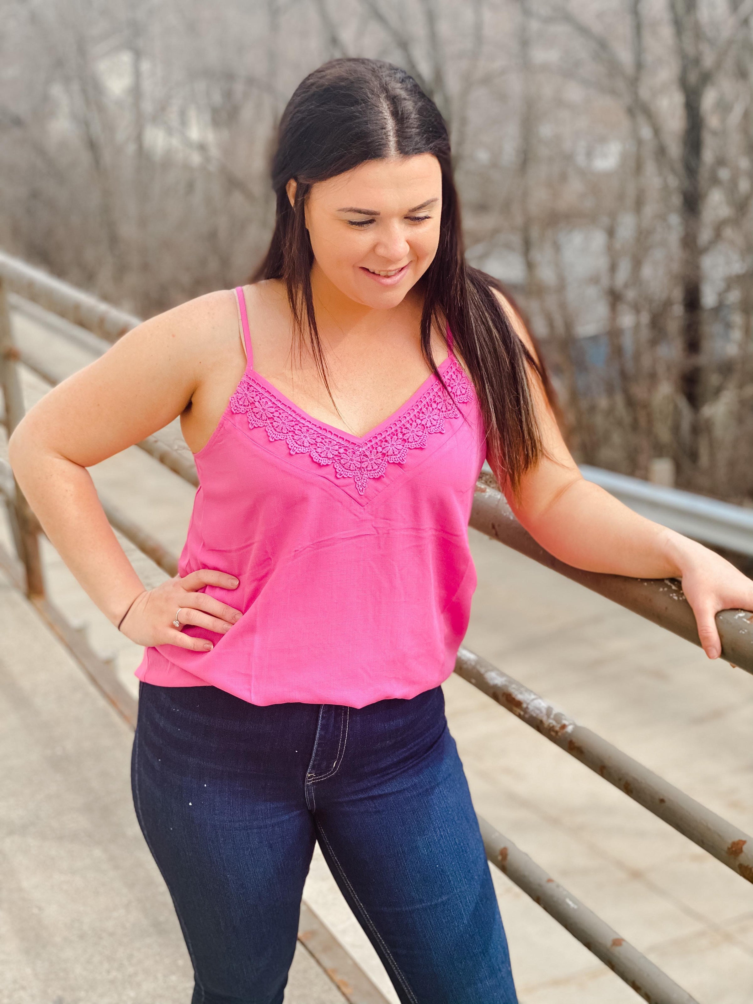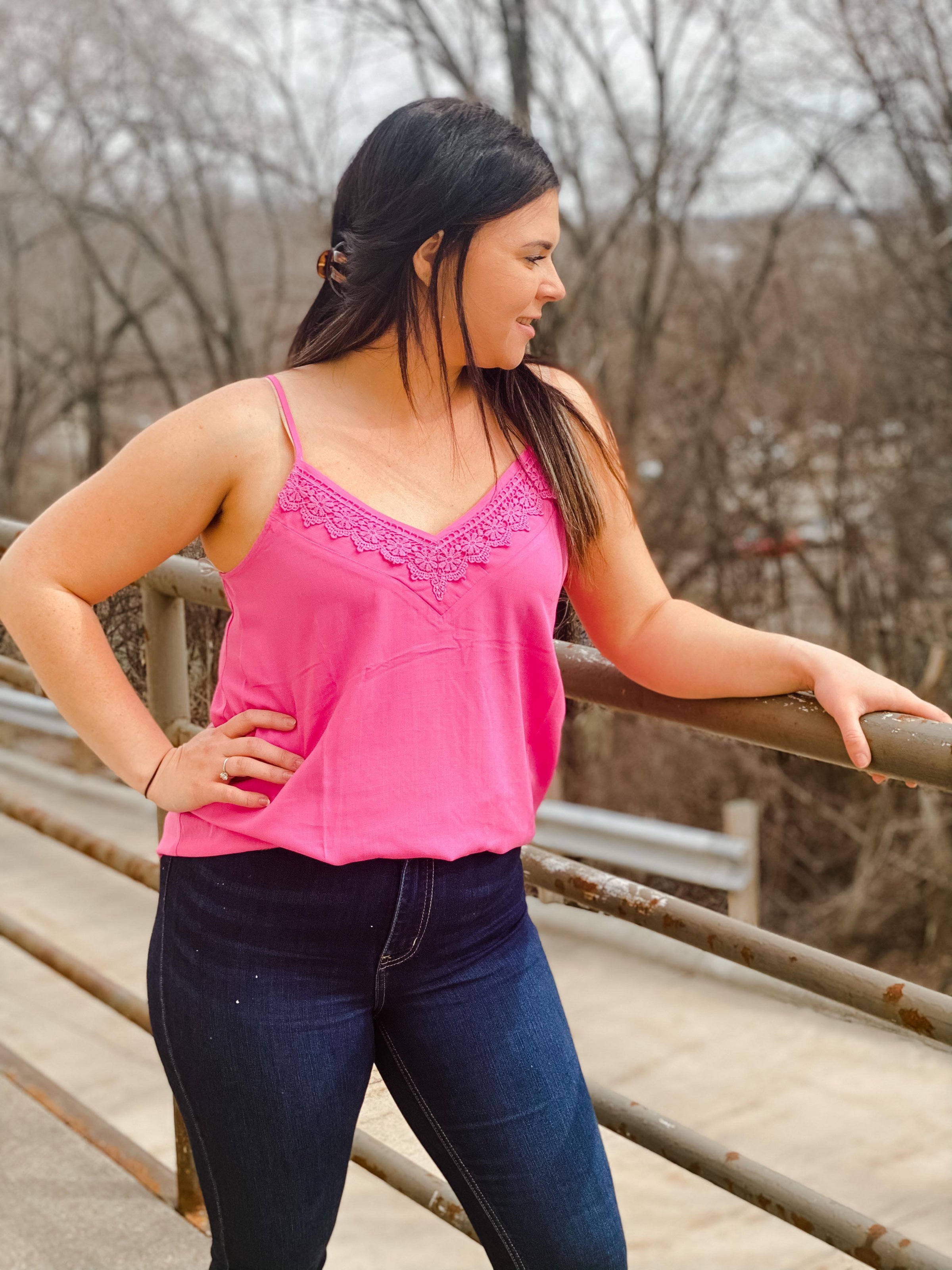 If you love camis that are versatile and adorable this one is for you-- and we have various color options. This camisole features an adorable lace detail along the v-neck line and is great to wear on its own. Or you can dress this up with a cardigan, moto jackets, jean jackets, and more