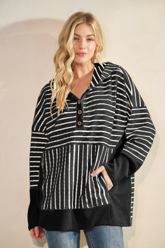 Effortless comfort meets contemporary style with the Alison Striped Hooded Pullover. This relaxed-fit tunic features a classic stripe pattern and cozy hood, making it the perfect layering piece for casual days or weekend getaways. The generous cut flatters all body types while the soft fabric keeps you feeling comfortable from morning to night. Whether you're running errands or meeting friends, this versatile hoodie transitions seamlessly into any wardrobe.