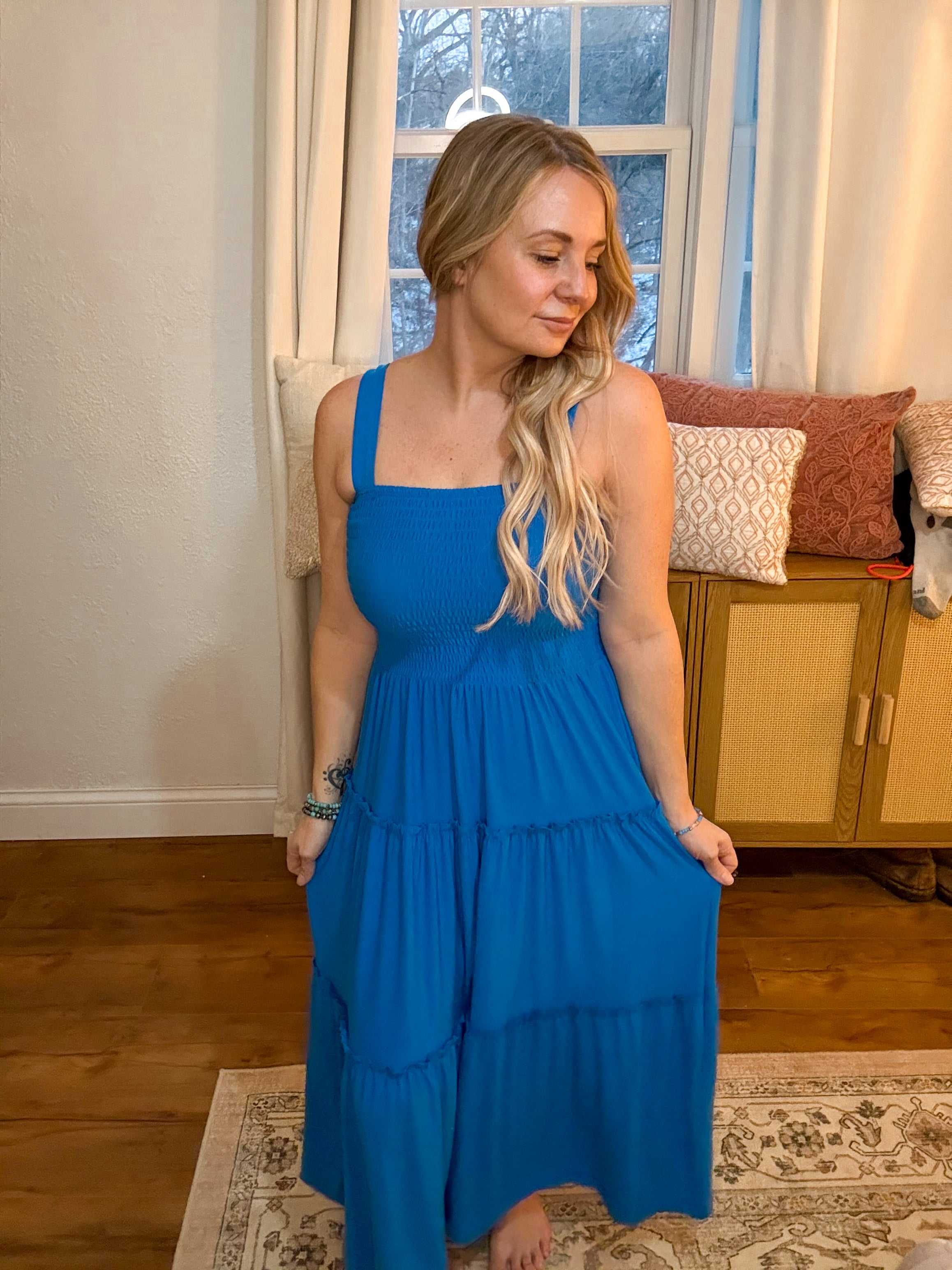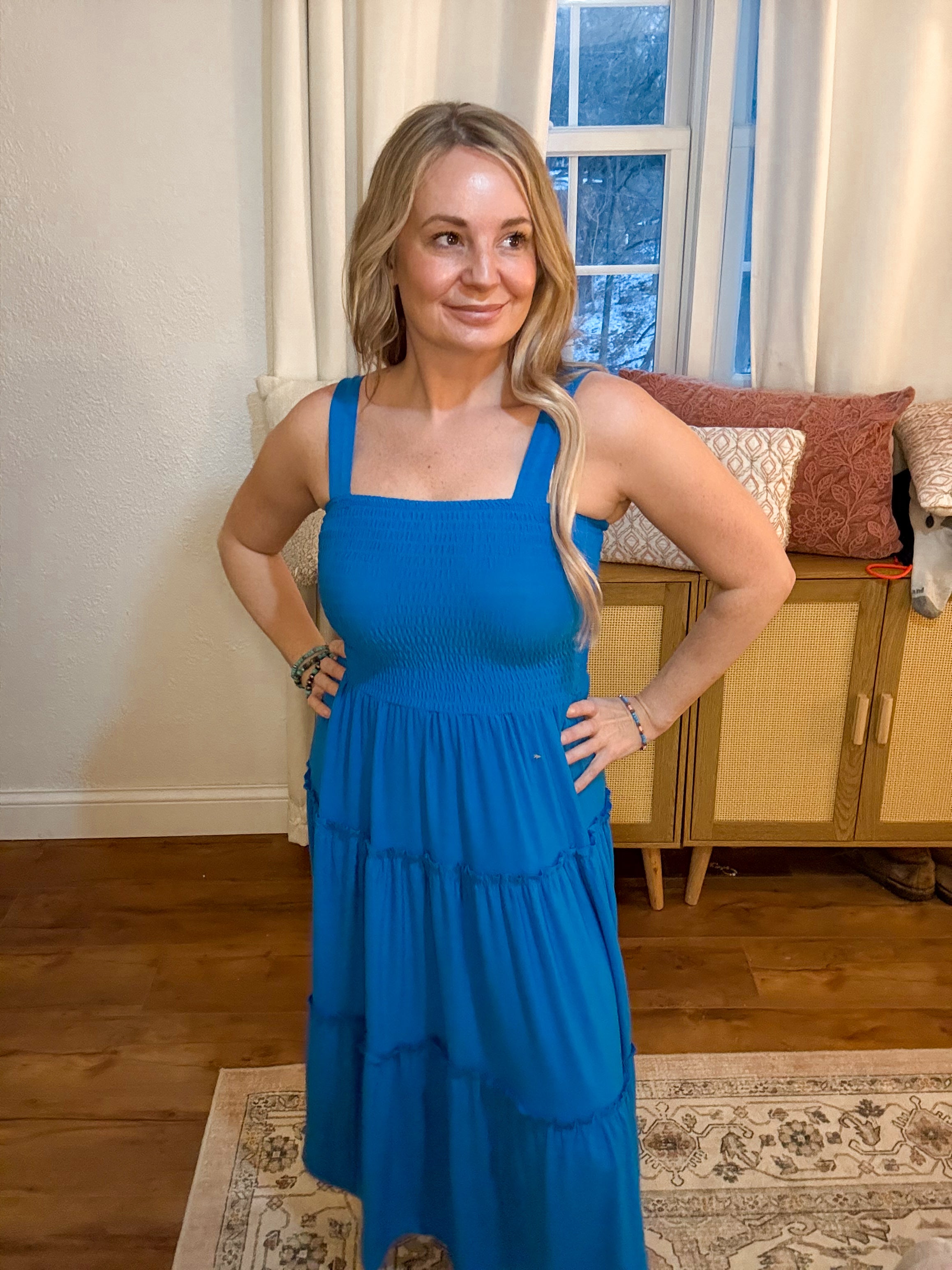 The Valerie Smocked Tiered Midi Dress features a tiered design with a smocked chest, providing a comfortable and stretchy fit ideal for travel and vacation settings. This dress combines style with practicality, ensuring ease of movement and versatility for various occasions.