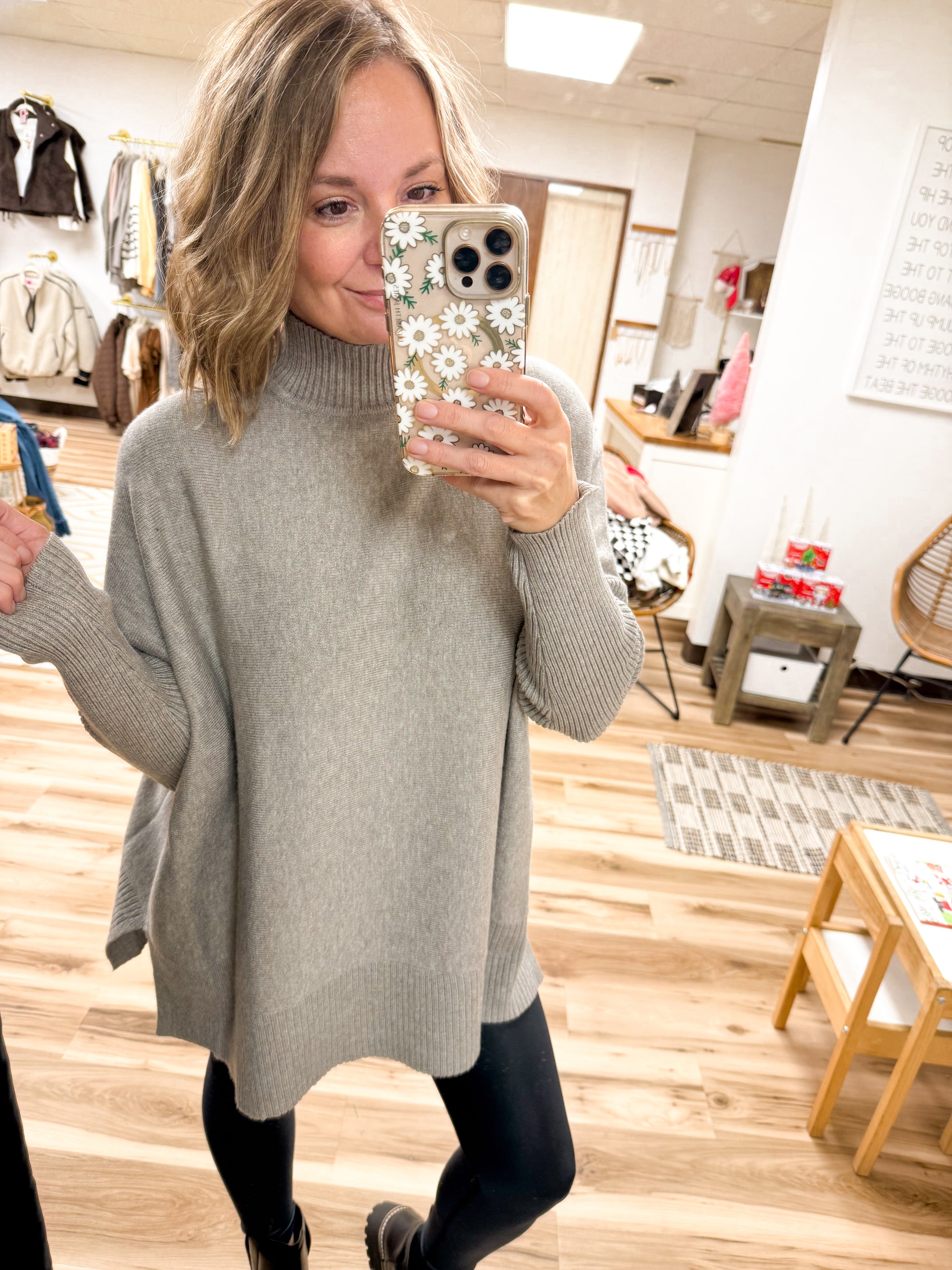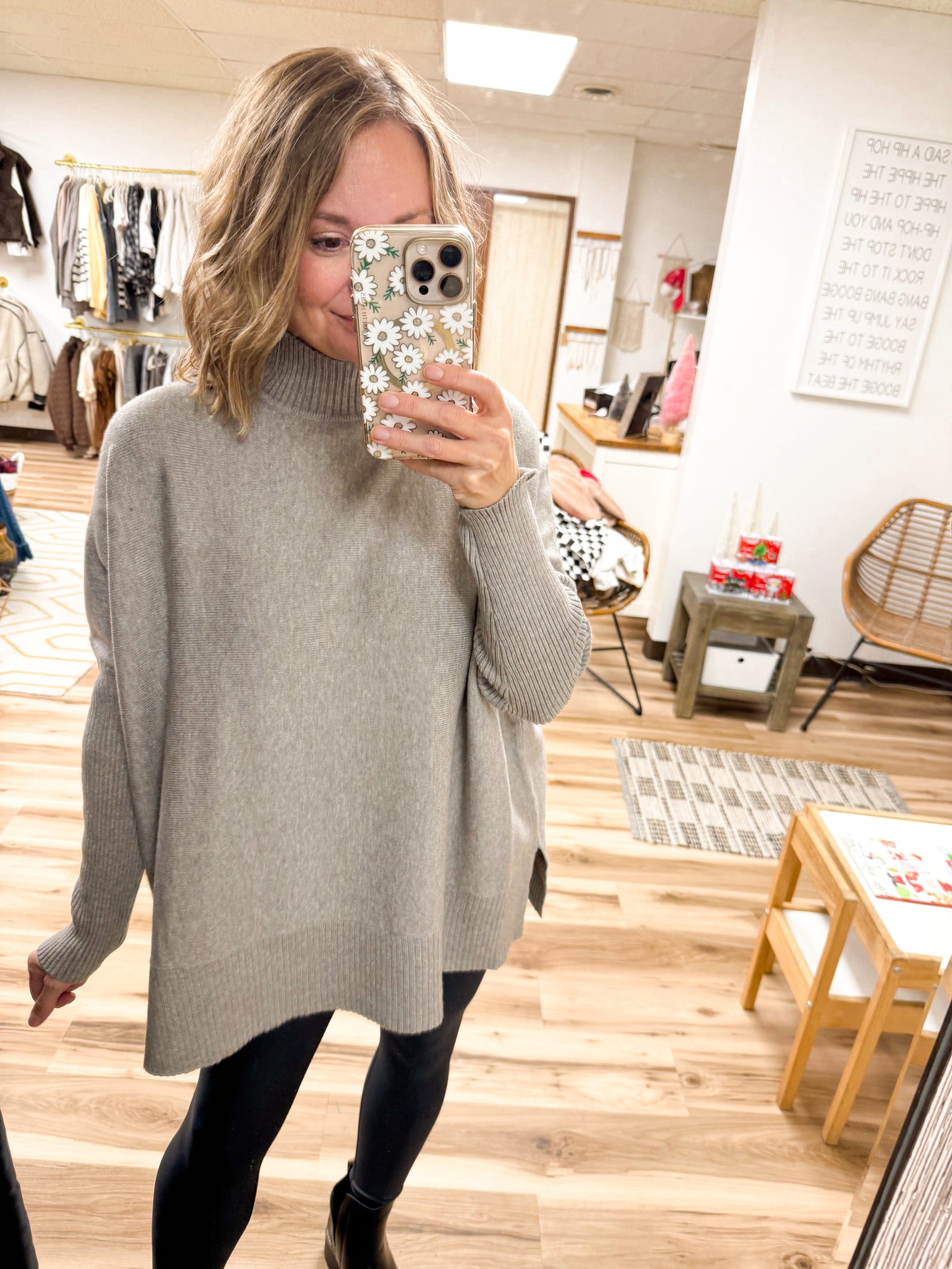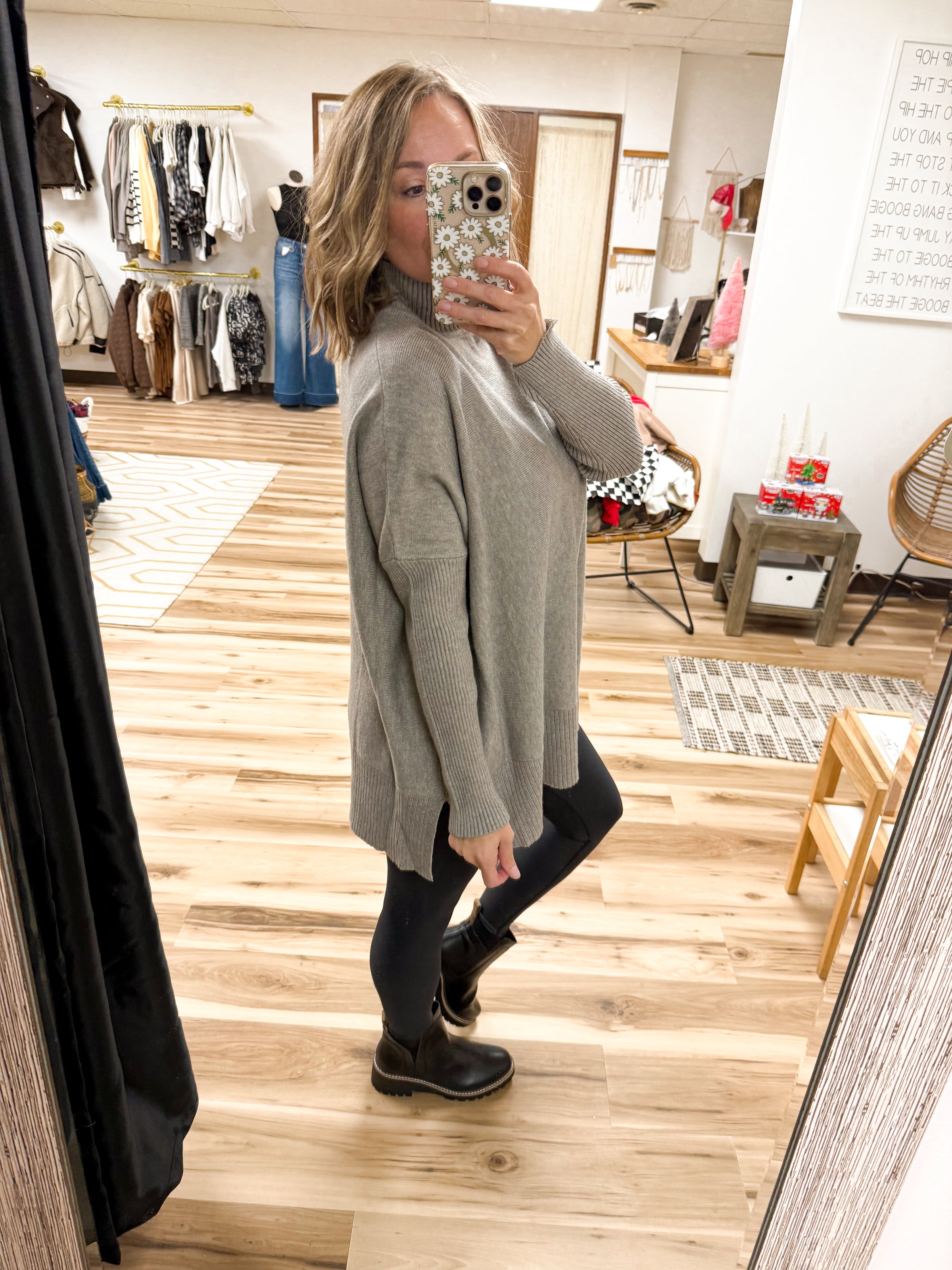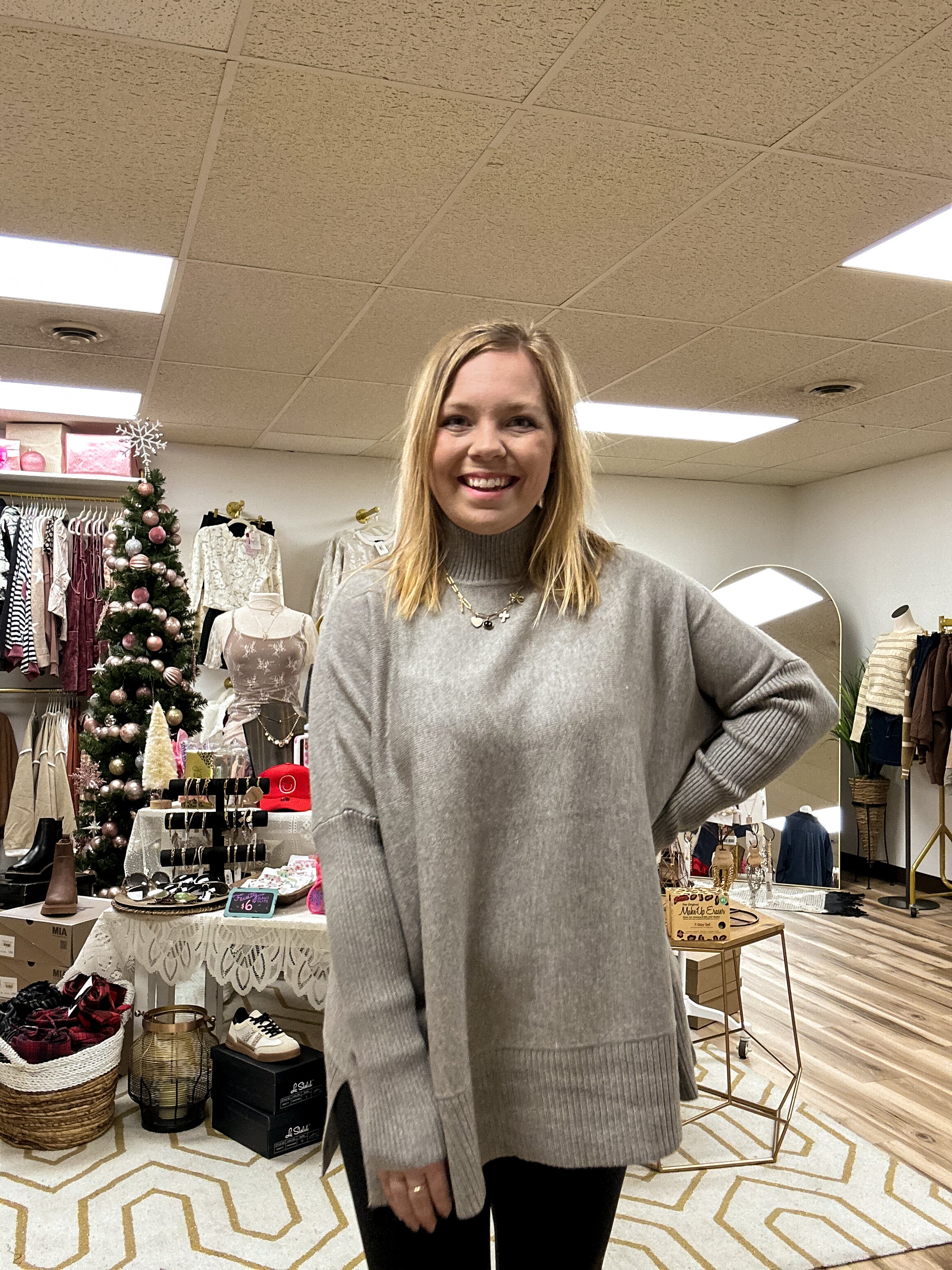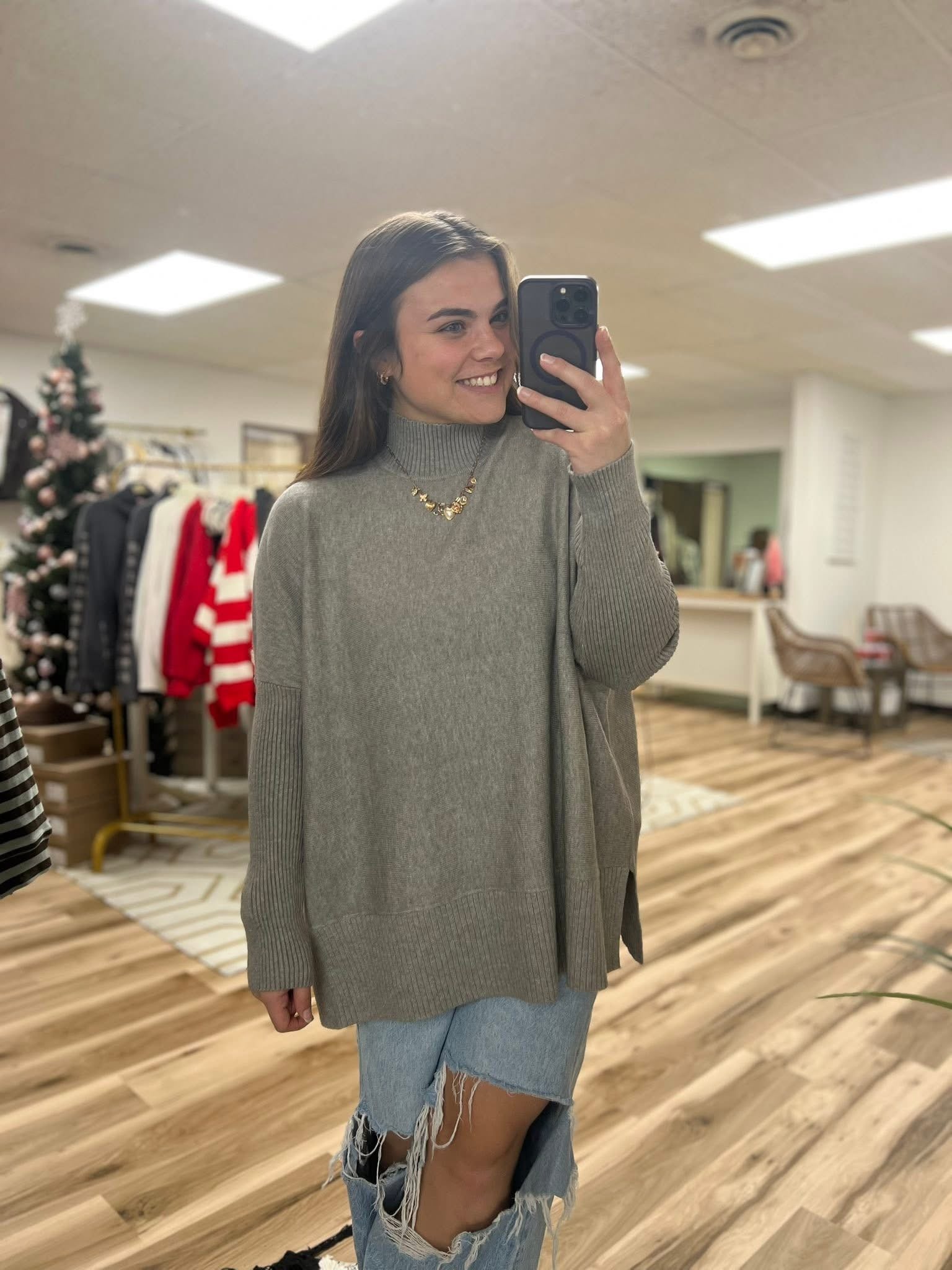 Indulge in comfort and style with our Grey Mock Neck Oversized Sweater Top. Made from ultra soft fabric, this tunic top is perfect for layering and keeping you warm in cool weather. The mock neck and drop shoulder add a touch of chic, while it pairs effortlessly with jeans or leggings. Accessorize with long necklaces and scarves for a complete look.