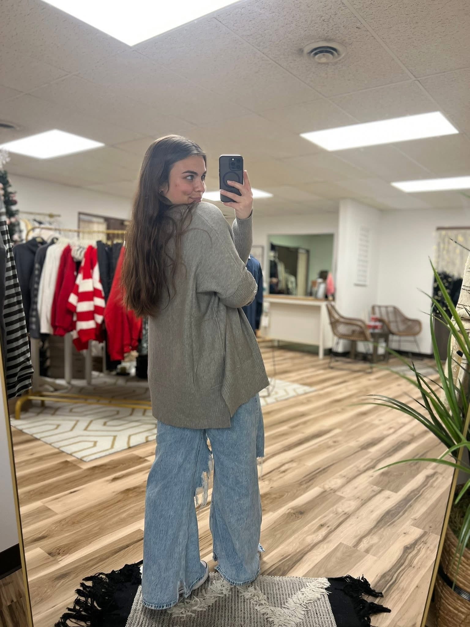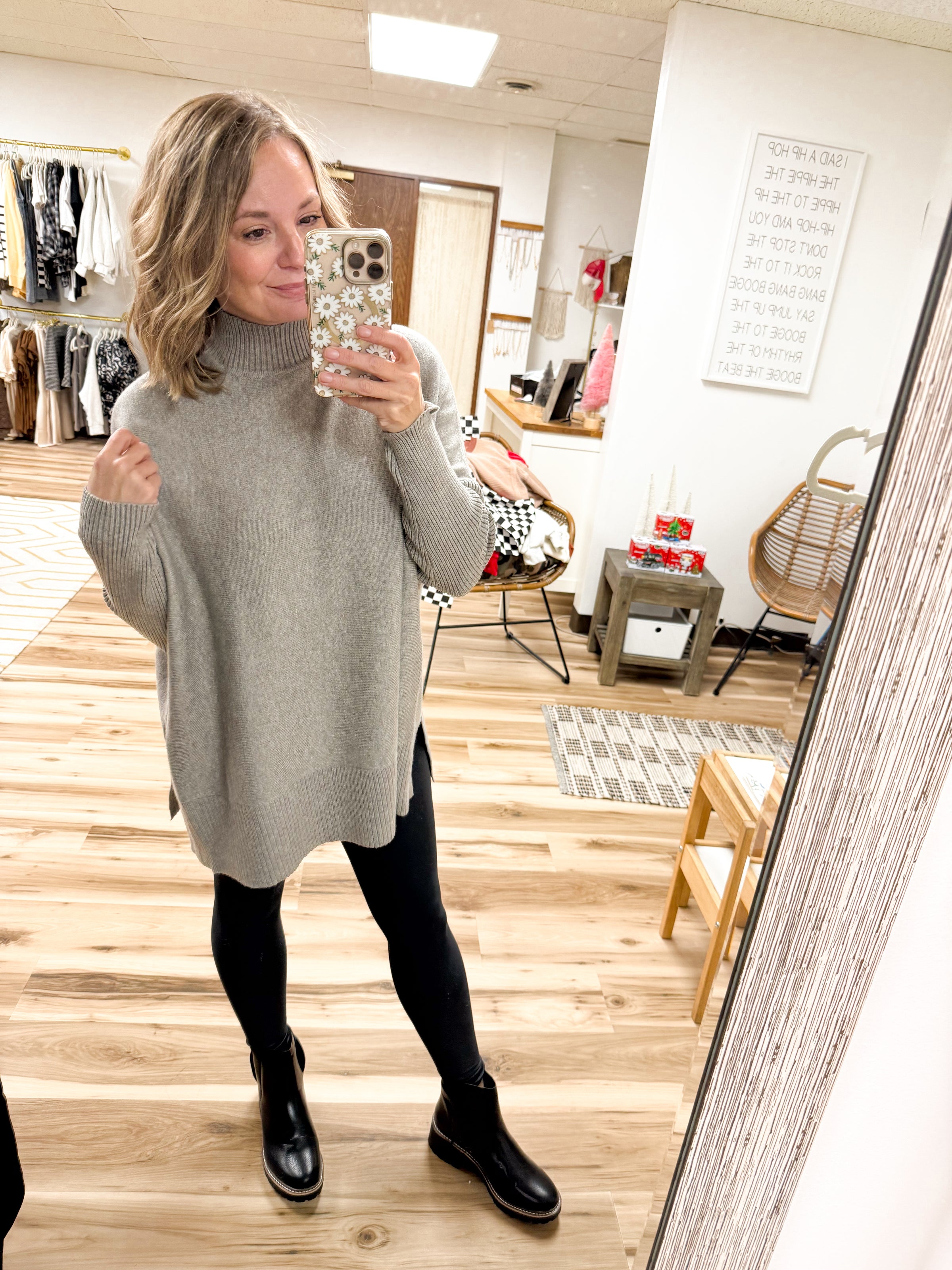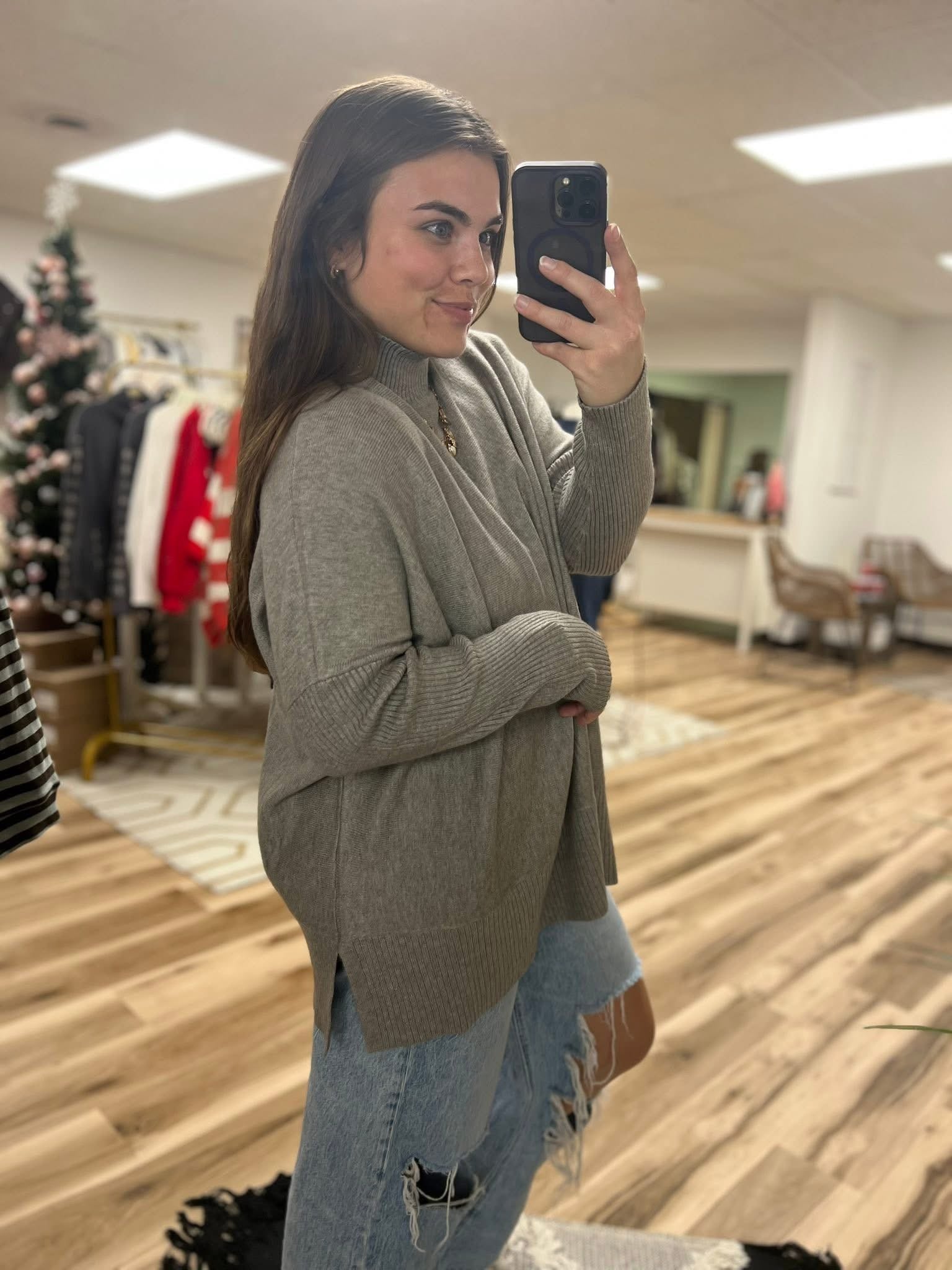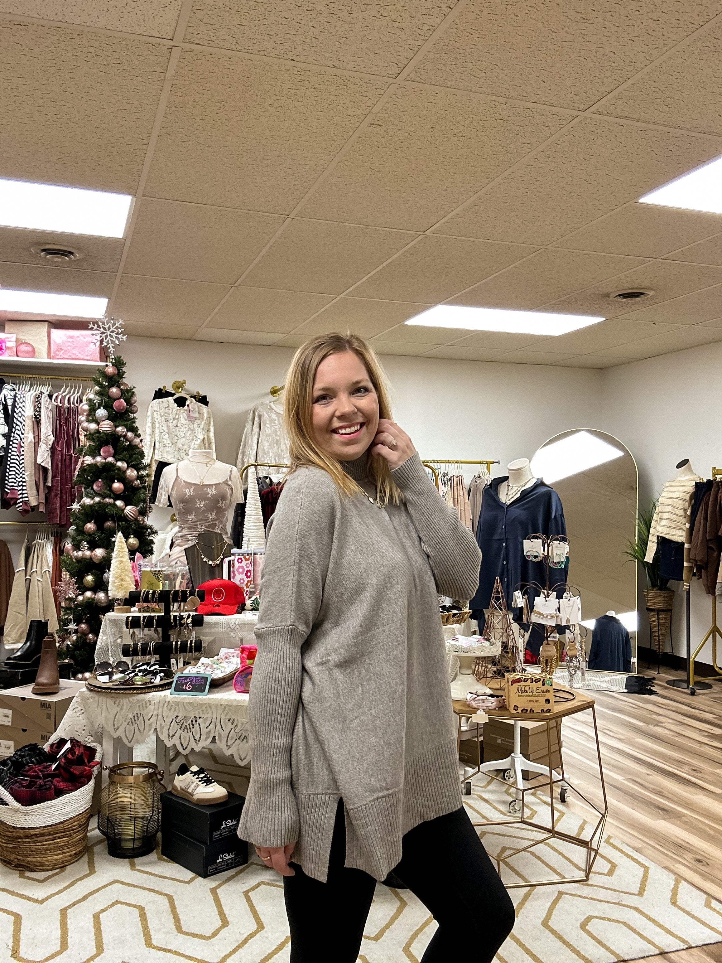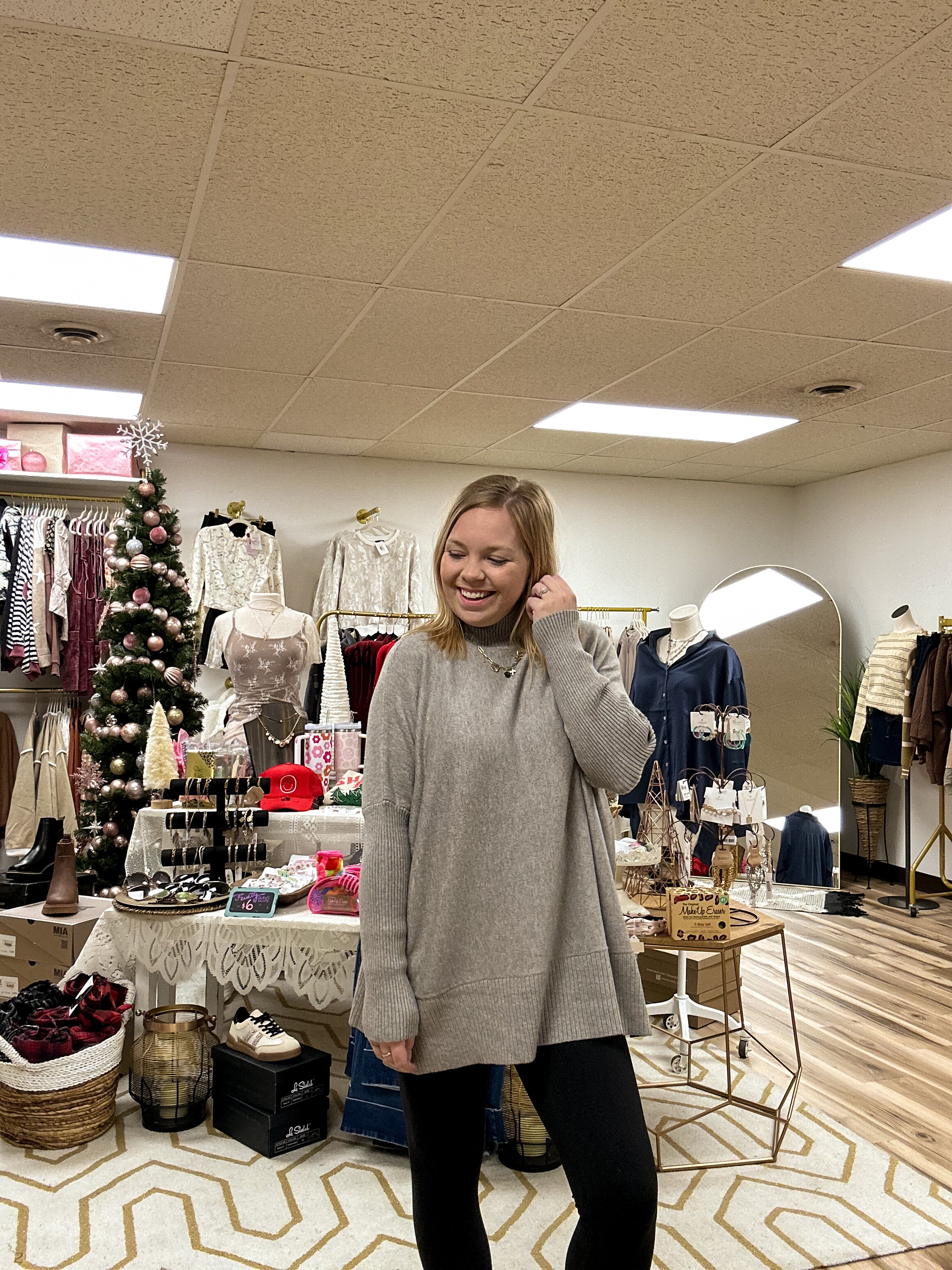 Indulge in comfort and style with our Grey Mock Neck Oversized Sweater Top. Made from ultra soft fabric, this tunic top is perfect for layering and keeping you warm in cool weather. The mock neck and drop shoulder add a touch of chic, while it pairs effortlessly with jeans or leggings. Accessorize with long necklaces and scarves for a complete look.