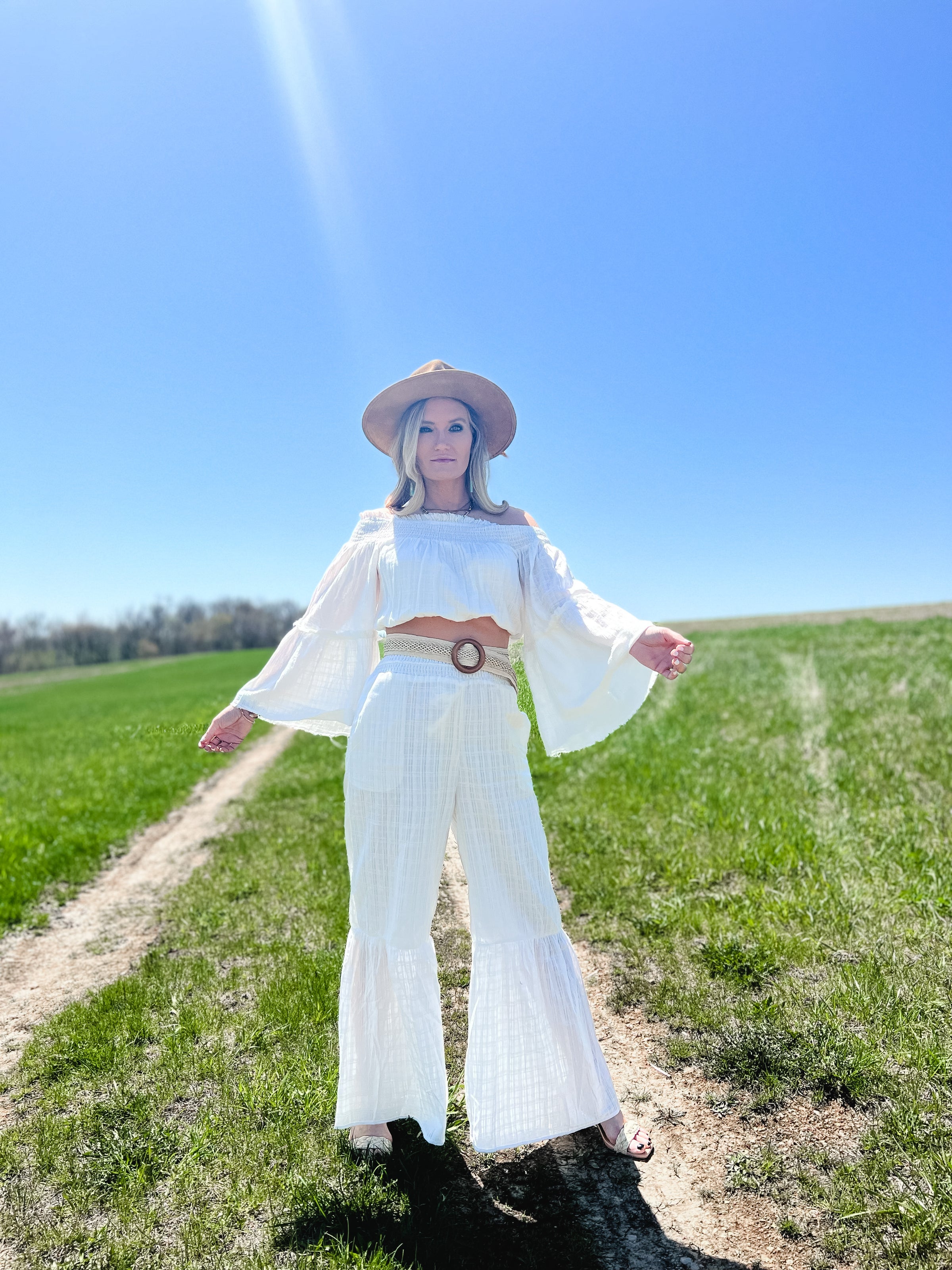 A solid, woven beach pant that are extremely comfortable and versatile! You can pair these with your favorite graphic tees for an edgy look, pair it with a solid tank and cute cardigan on the chillier nights, pair it with your favorite bikini or crop top for a beach look or go grab the Sidaly off the shoulder top and wear both beauties as a set!